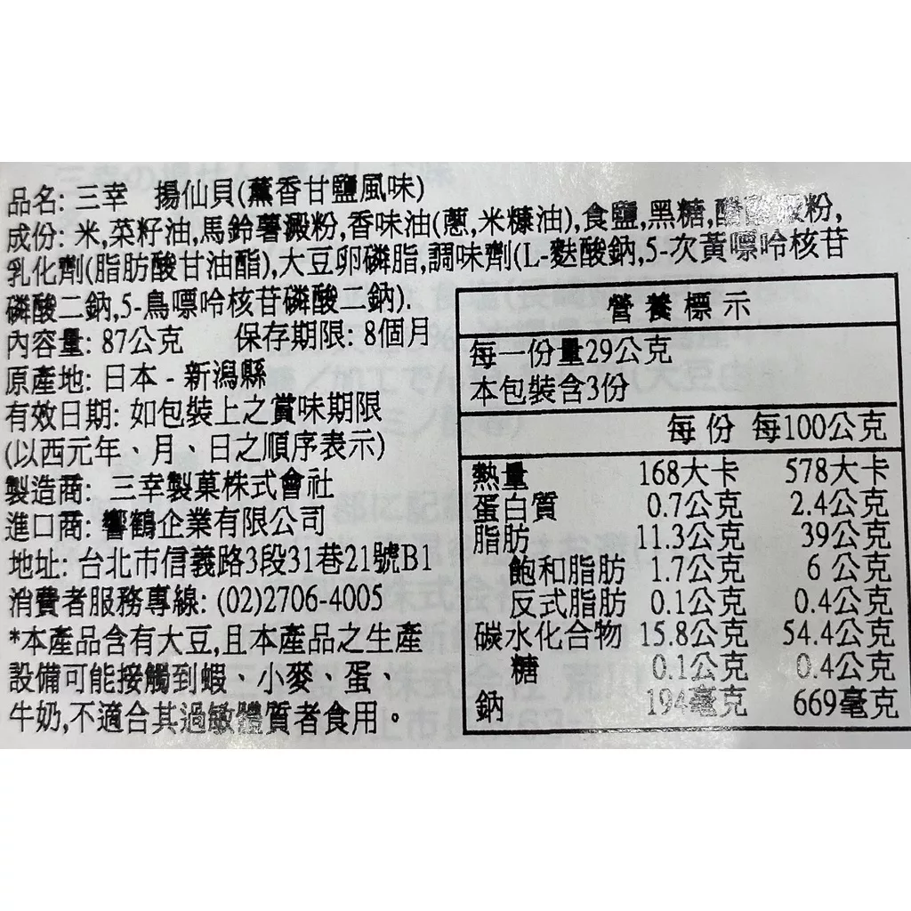 【商品規格】 淨重87g 【商品介紹】 ■日本原裝進口 ■三幸揚仙貝(薰香甘鹽) 【成份說明】 如圖示 【使用方式】 開封後請立即食用完畢 【有效日期說明】 90天~365天-以消費者收受日起算,至少距有效日期前30日以上 【過敏原資訊】 本產品含有牛奶麩質的穀物、蛋類、大豆及其製品之過敏原. 【保存注意事項】 請置於陰涼乾燥處,避免高溫或陽光直曬,常溫保存。 【退換貨服務】 鑑賞期非試用期,退回產品必須是全新狀態且包裝完整 ( 保持產品、附件、包裝、廠商紙箱及所有附隨文件或資料之完整性 ) 。 【購買注意事項】 網路店所售出的商品僅可在網路店進行退換貨服務,將無法在全國佳瑪實體門市進行退換貨、退款服務。若與實體門市價格不同時,請以網站公告為主。 ●依據消費者保護法之規定,食品類商品屬於易於腐敗、保存期限較短之商品,蝦皮鑑賞期規範效期在兩個月內之商品,於收受商品後將無法享有猶豫期之權益且不得辦理退貨。 ●網頁商品會因為使用不同的品牌螢幕以及解析度不同,造成圖片顏色呈現略有不同,請以實品顏色為準。