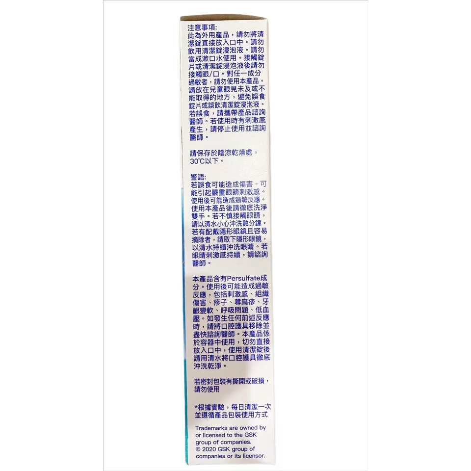 【商品規格】 36入/盒 【原產地】 愛爾蘭 【商品介紹】 潔淨清新,自信笑容 5分鐘快速清潔 有效去除牙垢,10倍更有效 【成份說明】 成分標示如背標 【使用方式】 先清除牙套、維持器假牙上大塊的食物殘渣 1. 倒入溫水(約40℃)直到蓋過牙套、維持器。放入一顆清潔錠,浸泡5分鐘。 2. 浸泡過後,請用浸泡液及軟毛刷來刷洗牙套、維持器。使用過後,請將浸泡液棄置,切勿重複使用。 3. 配戴牙套、維持器前,請務必先用清水徹底沖洗牙套、維持器後再進行配戴。 【保存期限】 23個月 【使用注意事項】 請置於陰涼乾燥處,避免高溫或陽光直曬。 【退換貨服務】 鑑賞期非試用期,退回產品必須是全新狀態且包裝完整 ( 保持產品、附件、包裝、廠商紙箱及所有附隨文件或資料之完整性 ) 。 【購買注意事項】 網路店所售出的商品僅可在網路店進行退換貨服務,將無法在全國佳瑪實體門市進行退換貨、退款服務。若與實體門市價格不同時,請以網站公告為主。