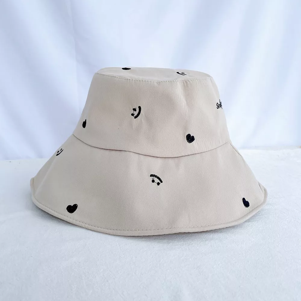 刺繡笑臉 時尚漁夫帽 大帽檐 顯瘦 韓風 遮陽 防曬 配件 音樂祭顏色:米白