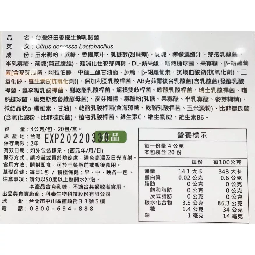 【商品規格】 4g/包,20包/盒 產地:台灣 貨源:國內原廠公司貨 【商品介紹】 ●韓國專利雙層包埋技術 ●13種益生菌,維持消化道機能 ●添加果寡糖、半乳寡糖 ●香檬口味,特殊香氣 ●顆粒狀,酸甜口感 【成份說明】 玉米澱粉、蔗糖、香檬原汁、乳糖醇(甜味劑)、乳糖、檸檬濃縮汁、芽孢乳酸菌、半乳寡糖、菊糖(菊苣纖維)、難消化性麥芽糊精、DL-蘋果酸、嗜熱鏈球菌、果寡糖、β-胡蘿蔔素[含麥芽糊精、阿拉伯膠、中鏈三酸甘油酯、蔗糖、β-胡蘿蔔素、抗壞血酸鈉(抗氧化劑)、二氧化矽、維生素E(抗氧化劑)]、保加利亞乳酸桿菌、AB克菲爾複合乳酸菌[含乳酸菌(發酵乳酸桿菌、鼠李糖乳酸桿菌、副乾酪乳酸桿菌、龍根雙歧桿菌、嗜酸乳酸桿菌、瑞士乳酸桿菌、嗜熱鏈球菌、馬克斯克魯維酵母菌)、麥芽糊精、寡醣粉(乳糖、果寡醣、半乳寡醣、麥芽糊精)、微結晶狀α-纖維素、甘油] 、乾酪乳酸桿菌(含海藻糖、乾酪乳酸桿菌、玉米澱粉)、比菲德氏菌 (含氧化澱粉、比菲德氏菌)、植物乳酸桿菌、維生素C、維生素B2、維生素B6。 【使用方式】 請勿以50度以上熱開水沖泡。 開封即食,可於三餐飯前或飯後食用。 基礎保健:每日一包/積極保健:每日早、中、晚各一包。 【有效日期說明】 90天~365天-以消費者收受日起算,至少距有效日期前30日以上 【過敏原資訊】 本產品含有乳糖,不適合其過敏者食用。 【使用注意事項】 請置於陰涼乾燥處,避免高溫或陽光直曬。 【退換貨服務】 鑑賞期非試用期,退回產品必須是全新狀態且包裝完整 ( 保持產品、附件、包裝、廠商紙箱及所有附隨文件或資料之完整性 ) 。 【購買注意事項】 網路店所售出的商品僅可在網路店進行退換貨服務,將無法在全國佳瑪實體門市進行退換貨、退款服務。若與實體門市價格不同時,請以網站公告為主。 ●依據消費者保護法之規定,食品類商品屬於易於腐敗、保存期限較短之商品,蝦皮鑑賞期規範效期在兩個月內之商品,於收受商品後將無法享有猶豫期之權益且不得辦理退貨。 ●網頁商品會因為使用不同的品牌螢幕以及解析度不同,造成圖片顏色呈現略有不同,請以實品顏色為準。