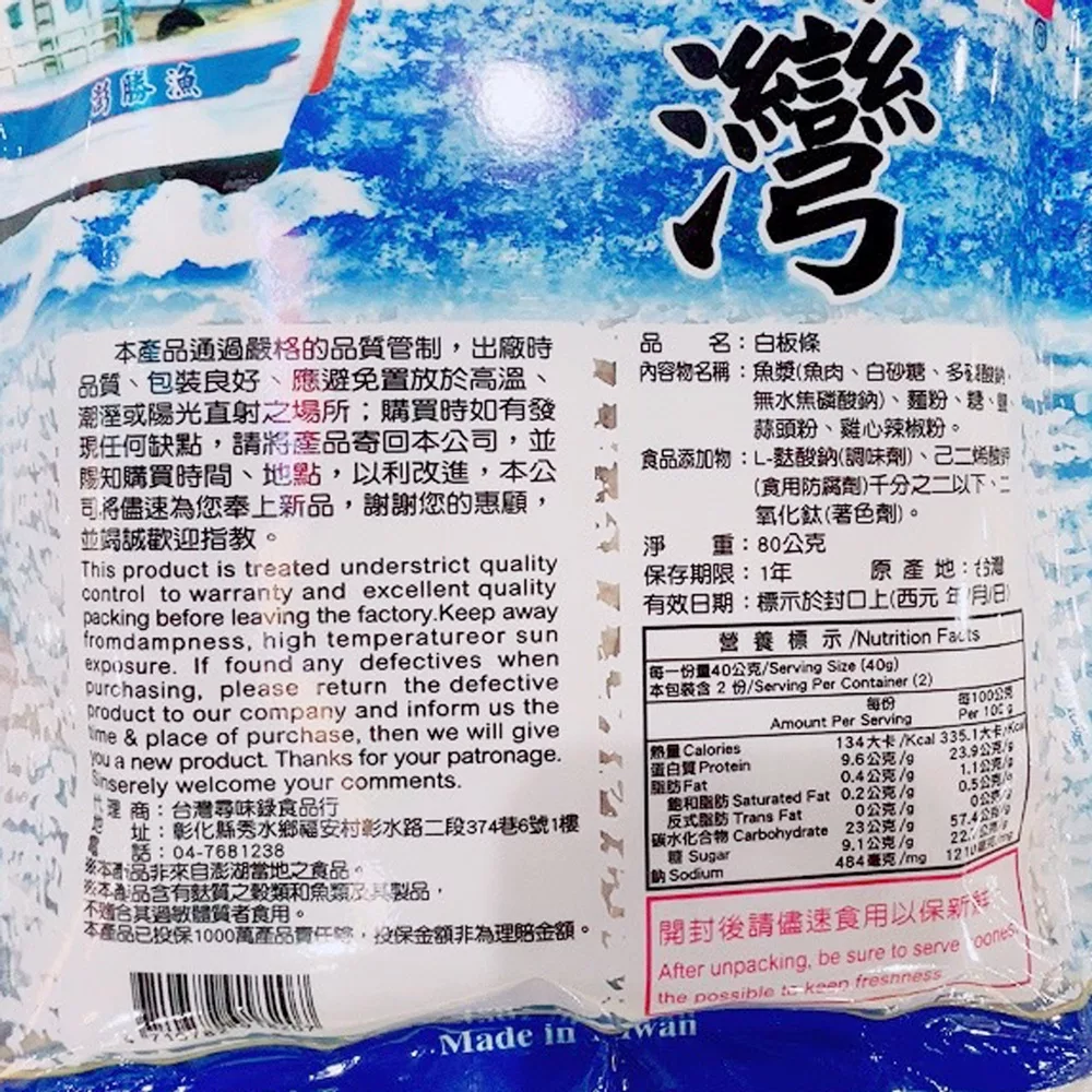 【商品規格】 80g 【商品介紹】 台灣尋味錄澎湖灣白板條 【成份說明】 魚漿(魚肉、白砂糖、多磷酸鈉、無水焦磷酸鈉)、麵粉、糖、鹽、蒜頭粉、雞心辣椒粉。 食品添加物:L-麩酸鈉(調味劑)、已二烯酸鉀(食用防腐劑)千分之二以下、食用色素紅色6號(著色劑)。 【有效日期說明】保存期限:一年 【過敏原資訊】 ※本產品非來自澎湖當地之食品 ※本產品含有麩質之穀類、蝦類和魚漿及其製品,不適合過敏體質者食用。 ※本產品已投保1000萬產品責任險,投保金額非為理賠金額。 【使用注意事項】 請置於陰涼乾燥處,避免高溫或陽光直曬。 【退換貨服務】 鑑賞期非試用期,退回產品必須是全新狀態且包裝完整 ( 保持產品、附件、包裝、廠商紙箱及所有附隨文件或資料之完整性 ) 。 【購買注意事項】 網路店所售出的商品僅可在網路店進行退換貨服務,將無法在全國佳瑪實體門市進行退換貨、退款服務。若與實體門市價格不同時,請以網站公告為主。 ●依據消費者保護法之規定,食品類商品屬於易於腐敗、保存期限較短之商品,蝦皮鑑賞期規範效期在兩個月內之商品,於收受商品後將無法享有猶豫期之權益且不得辦理退貨。 ●網頁商品會因為使用不同的品牌螢幕以及解析度不同,造成圖片顏色呈現略有不同,請以實品顏色為準。