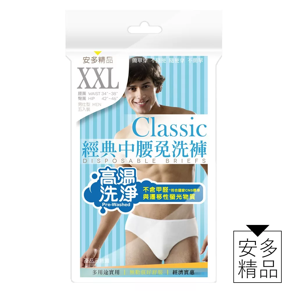 【商品規格】 5入/包 尺寸: L /XL /XXL /3XL 【產地】 越南 【商品介紹】 ●高溫洗淨 ●均通過SGS、Intertek與國家檢驗不含遷移性螢光劑與甲醛 ●寬邊褲腰織帶 服貼度提升 ●無勒痕好舒服 【成份說明】 T/C: 80%聚酯纖維、 20% 棉 【使用方式】 一次性使用 【使用注意事項】 請置於陰涼乾燥處,避免高溫或陽光直曬。 請勿吞食 【退換貨服務】 鑑賞期非試用期,退回產品必須是全新狀態且包裝完整 ( 保持產品、附件、包裝、廠商紙箱及所有附隨文件或資料之完整性 ) 。 【購買注意事項】 網路店所售出的商品僅可在網路店進行退換貨服務,將無法在全國佳瑪實體門市進行退換貨、退款服務。若與實體門市價格不同時,請以網站公告為主。
