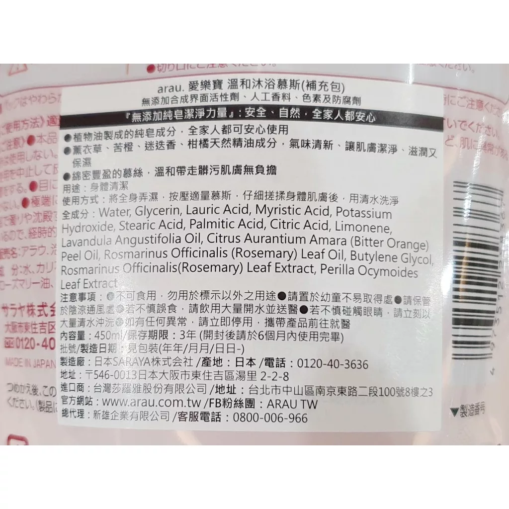 【商品規格】 規格/容量:450ml 產地:日本 貨源:國內原廠公司貨 保存期限:3年 【商品介紹】 ‧植物油製成的純皂成份,全家都可安心使用 ‧綿密豐盈的慕絲,溫和帶走髒污肌膚無負擔 【成份說明】 請詳見產品背標 【使用方式】 將全身弄絲,按壓適量慕斯,仔細搓揉身體肌膚後,用清水洗淨 【使用注意事項】 使用中或使用後若有任何不適時,請停止使用並諮詢醫師 【退換貨服務】 鑑賞期非試用期,退回產品必須是全新狀態且包裝完整 ( 保持產品、附件、包裝、廠商紙箱及所有附隨文件或資料之完整性 ) 。 【購買注意事項】 網路店所售出的商品僅可在網路店進行退換貨服務,將無法在全國佳瑪實體門市進行退換貨、退款服務。若與實體門市價格不同時,請以網站公告為主。