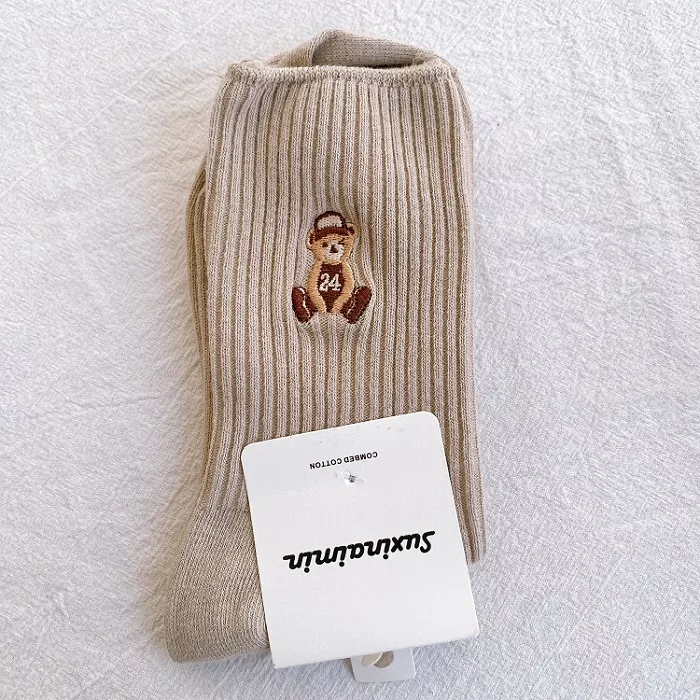 戴帽子小熊刺繡中筒襪顏色:奶茶色