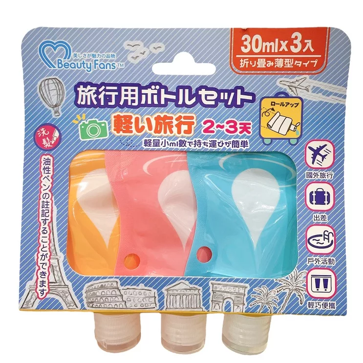 【商品規格】 30ml*3 產地:中國 效期10年 【商品介紹】 旅行分裝好方便且不佔空間 【成份說明】 聚乙稀+樹酯 【使用方式】 如圖標示 【使用注意事項】 1.兒童請勿接近收納袋,以免造成窒息的危險。 2.請勿收納水份、潮濕、尖銳、食品、皮製品、絲綢或是羽毛製品。 3.收納尖銳物品將損害收納袋密封功能。 4.請勿將收納袋做非收納用途使用。 5.本產品請遠離火源處,並置放陰涼乾燥處,以維持產品壽命。 【退換貨服務】 鑑賞期非試用期,退回產品必須是全新狀態且包裝完整 ( 保持產品、附件、包裝、廠商紙箱及所有附隨文件或資料之完整性 ) 。 【購買注意事項】 網路店所售出的商品僅可在網路店進行退換貨服務,將無法在全國佳瑪實體門市進行退換貨、退款服務。若與實體門市價格不同時,請以網站公告為主。