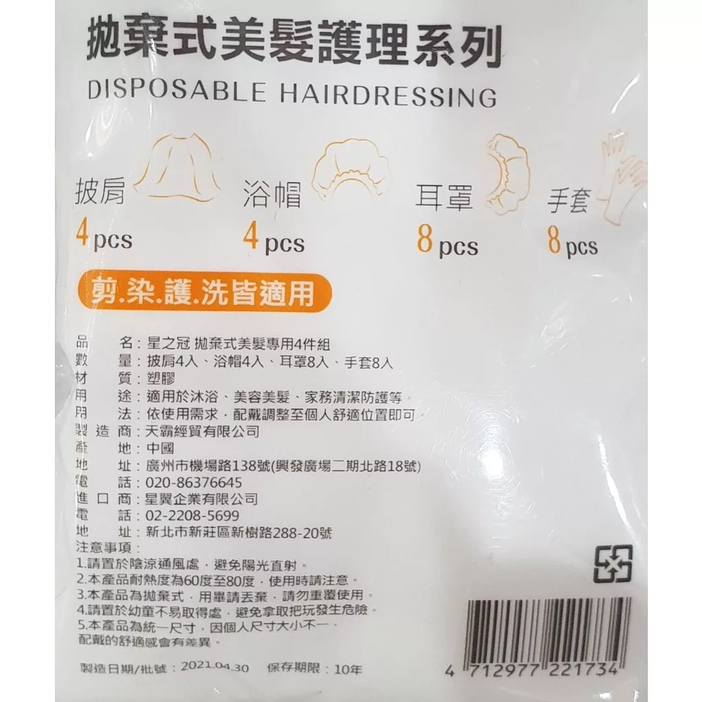 【商品規格】 規格/容量:披肩*4、浴帽*4、耳罩*8、手套*8 產地:中國 貨源:國內原廠公司貨 保存期限:10年 【商品介紹】 用於沐浴、美容美髮、家務清潔防護等 【成份說明】 請詳見產品背標 【使用方式】 依使用需求,配戴調整至個人舒適位置即可 【使用注意事項】 本產品耐熱度為60-80度 本產品為拋棄式,請勿重複使用 【退換貨服務】 鑑賞期非試用期,退回產品必須是全新狀態且包裝完整 ( 保持產品、附件、包裝、廠商紙箱及所有附隨文件或資料之完整性 ) 。 【購買注意事項】 網路店所售出的商品僅可在網路店進行退換貨服務,將無法在全國佳瑪實體門市進行退換貨、退款服務。若與實體門市價格不同時,請以網站公告為主。