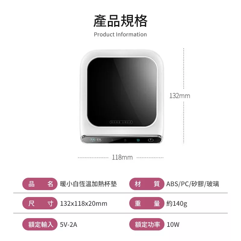 【商品規格】 材質:塑料、矽膠、玻璃 重量:約140g 尺寸:132 X 118 X 20mm 數量:1入 額定電壓:DC 5V/2A 額定功率:10W 供電方式:USB供電 產地:中國 面板溫度:三檔調溫(約70度C/90度C / 110度C) 【使用步驟】 1. 將暖小白USB插口連接5V/2A以上的充電頭或設備,機器會發出“嗶”聲,表示通電完成。 2. 輕觸右邊電源鍵,“嗶”聲後中間三個加熱符號會同時閃動。若底座沒放上水杯也會呈現閃爍並停止加熱。 3. 放上杯子,自入進入一檔加熱,再次輕觸電源鍵可依序切換二檔/三檔/關閉。 4. 加熱時,輕觸左邊杯子符號,可開啟一小時定時提醒喝水,再次輕觸杯子符號,關閉喝水提醒。 【注意事項】 1. 暖小白有重力感應加熱安全設定,面板上的杯子需重150g。放上杯子開始加熱,拿起杯子停止加熱。 2. 切换所有開關/加熱檔次/提醒喝水時,面板上需有杯子。 3. 本產品為恆溫保溫杯墊,並無飲品加熱功效。 4. 請務必使用輸出電壓足DC 5V/2A的充電器,以免影響保溫效果。 【退換貨服務】 鑑賞期非試用期,退回產品必須是全新狀態且包裝完整 ( 保持產品、附件、包裝、廠商紙箱及所有附隨文件或資料之完整性 ) 。 【購買注意事項】 網路店所售出的商品僅可在網路店進行退換貨服務,將無法在全國佳瑪實體門市進行退換貨、退款服務。若與實體門市價格不同時,請以網站公告為主。