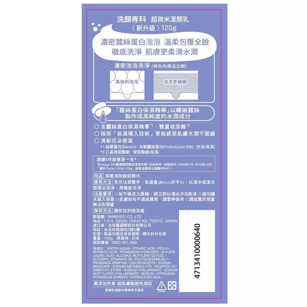【商品規格】 規格/容量:120g 重量:120g 尺寸:4.5*7*18.7cm 產地:日本 【商品介紹】 八年連續銷售第一名新保濕導入技術濃密泡泡超微米潔顏乳洗靜同時保濕。 【成份說明】 WATER (AQUA)・STEARIC ACID・PEG-8・MYRISTIC ACID・POTASSIUM HYDROXIDE・GLYCERIN・LAURIC ACID・ALCOHOL・BUTYLENE GLYCOL・GLYCERYL STEARATE SE・POLYQUATERNIUM-7・FRAGRANCE (PARFUM)・DISODIUM EDTA・SODIUM BENZOATE・SODIUM METABISULFITE・PEG/PPG-14/7 DIMETHYL ETHER・SODIUM HYALURONATE・SODIUM ACETYLATED HYALURONATE・SERICIN・CITRIC ACID・POTASSIUM SORBATE・HYDROLYZED SILK 【使用方式】 參閱實體商品背標 【使用注意事項】 ●如不慎流入眼睛,請立即以清水沖洗乾淨 ●請勿讓水進入容器 ●肌膚如有不適或異常,請暫停使用 ●請放置於孩童無法取得處 【退換貨服務】 鑑賞期非試用期,退回產品必須是全新狀態且包裝完整 ( 保持產品、附件、包裝、廠商紙箱及所有附隨文件或資料之完整性 ) 。 【購買注意事項】 網路店所售出的商品僅可在網路店進行退換貨服務,將無法在全國佳瑪實體門市進行退換貨、退款服務。若與實體門市價格不同時,請以網站公告為主。
