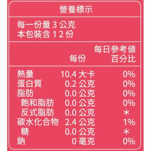 【商品規格】 36g/包,12顆/包 【商品介紹】 無糖Q軟糖,好吃又能提升美力 專為大人設計的Q軟糖,果香玫瑰 無糖、無色素、零脂肪! 產品特色 ✔︎ 添加法國蔓越梅 ✔︎ 專利洛神花萃取,天然抗氧化劑 ✔︎ 木糖醇取代砂糖,無糖無負擔 ✔︎ 不含六大過敏原(螃蟹、蝦子、芒果、花生、牛奶、蛋)) 【成份說明】 麥芽糖醇糖漿(甜味劑)、明膠(豬來源)、木糖醇(甜味劑)、香料、蘋果酸、檸檬酸、棕櫚蠟、棕櫚油、棕櫚核仁油、麥芽糊精、蔓越莓萃取物、洛神花萃取物 【使用方式】 1. 請存放於陰涼乾燥處、避免日光直射與遠離高溫環境。 2. 本產品遇高溫可能有融化變形之情形,但不影響品質,請安心食用。 3. 兒童及吞嚥咀嚼困難者請小心食用。 4. 素不可食。 【使用注意事項】 請置於陰涼乾燥處,避免高溫或陽光直曬。 【退換貨服務】 鑑賞期非試用期,退回產品必須是全新狀態且包裝完整 ( 保持產品、附件、包裝、廠商紙箱及所有附隨文件或資料之完整性 ) 。 【購買注意事項】 網路店所售出的商品僅可在網路店進行退換貨服務,將無法在全國佳瑪實體門市進行退換貨、退款服務。若與實體門市價格不同時,請以網站公告為主。 ●依據消費者保護法之規定,食品類商品屬於易於腐敗、保存期限較短之商品,蝦皮鑑賞期規範效期在兩個月內之商品,於收受商品後將無法享有猶豫期之權益且不得辦理退貨。 ●網頁商品會因為使用不同的品牌螢幕以及解析度不同,造成圖片顏色呈現略有不同,請以實品顏色為準。