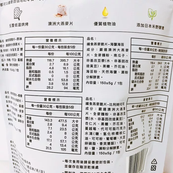 【商品規格】 150g 【商品介紹】 全素纖食燕麥脆片, 健康的食用零食,同時不會有任何負擔與罪惡感 【成份說明】 如圖示 【有效日期說明】 90天~365天-以消費者收受日起算,至少距有效日期前30日以上 【使用注意事項】 請置於陰涼乾燥處,避免高溫或陽光直曬。 【退換貨服務】 鑑賞期非試用期,退回產品必須是全新狀態且包裝完整 ( 保持產品、附件、包裝、廠商紙箱及所有附隨文件或資料之完整性 ) 。 【購買注意事項】 網路店所售出的商品僅可在網路店進行退換貨服務,將無法在全國佳瑪實體門市進行退換貨、退款服務。若與實體門市價格不同時,請以網站公告為主。 ●依據消費者保護法之規定,食品類商品屬於易於腐敗、保存期限較短之商品,蝦皮鑑賞期規範效期在兩個月內之商品,於收受商品後將無法享有猶豫期之權益且不得辦理退貨。 ●網頁商品會因為使用不同的品牌螢幕以及解析度不同,造成圖片顏色呈現略有不同,請以實品顏色為準。
