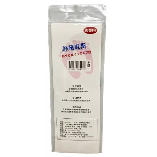 【商品規格】 1雙入 約23CM 產地:中國 【商品介紹】 舒緩鞋墊孩童用 【成份說明】 乙烯+醋酸乙烯共聚物+聚酯纖維 【使用注意事項】 請置於陰涼乾燥處,避免高溫或陽光直曬。 【退換貨服務】 鑑賞期非試用期,退回產品必須是全新狀態且包裝完整 ( 保持產品、附件、包裝、廠商紙箱及所有附隨文件或資料之完整性 ) 。 【購買注意事項】 網路店所售出的商品僅可在網路店進行退換貨服務,將無法在全國佳瑪實體門市進行退換貨、退款服務。若與實體門市價格不同時,請以網站公告為主。