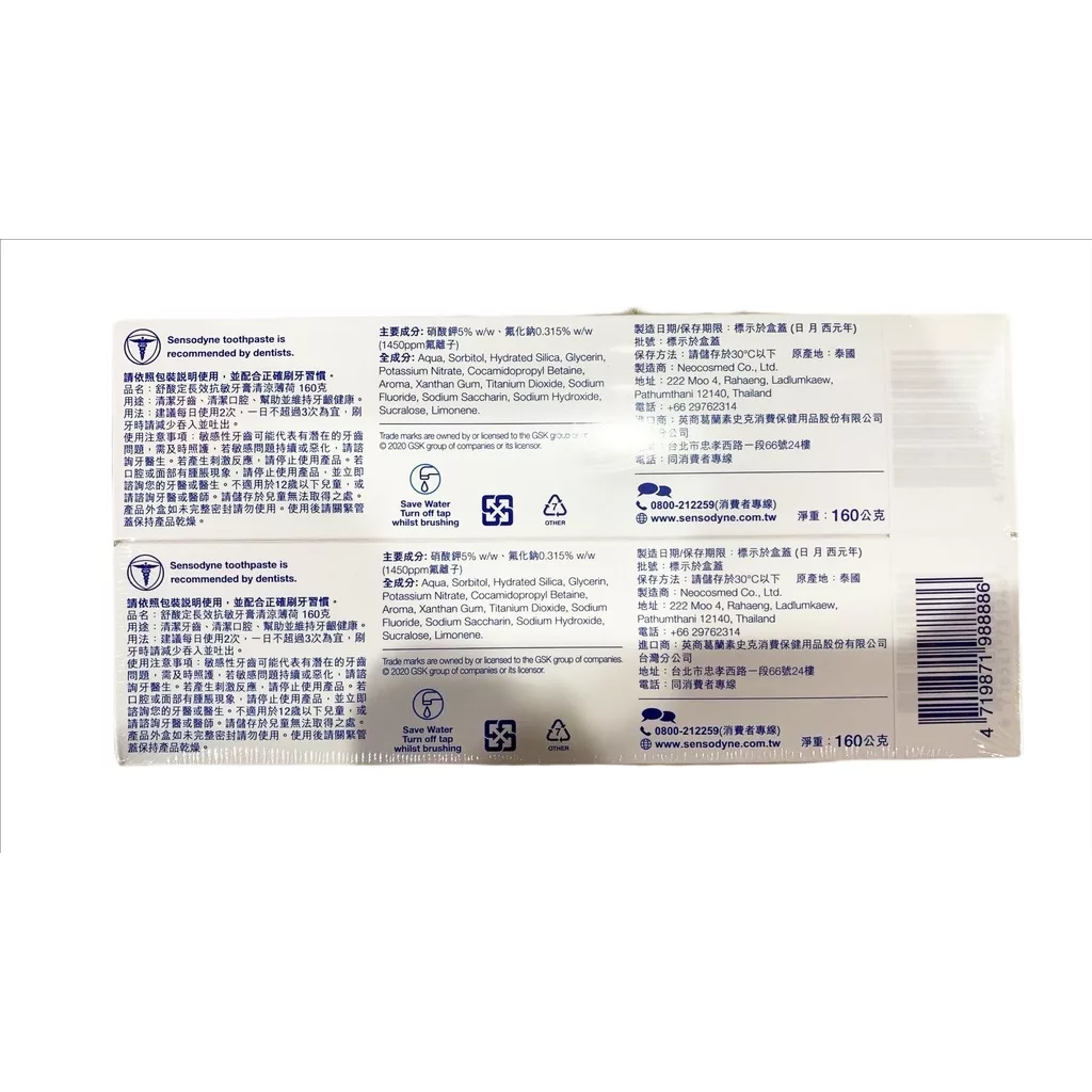 【商品規格】 160g*2入 【原產地】 泰國 【商品介紹】 台灣牙醫 第一推薦 給敏感性牙齒又想口氣清新的你 硝酸鉀有效並持續舒緩敏感性牙痛 保持口腔清潔,讓你整天口氣清新 【成份說明】 成分標示如背標 【使用方式】 每日使用兩次並配合正確刷牙習慣 【保存期限】 3年 【使用注意事項】 請置於陰涼乾燥處,避免高溫或陽光直曬。 【退換貨服務】 鑑賞期非試用期,退回產品必須是全新狀態且包裝完整 ( 保持產品、附件、包裝、廠商紙箱及所有附隨文件或資料之完整性 ) 。 【購買注意事項】 網路店所售出的商品僅可在網路店進行退換貨服務,將無法在全國佳瑪實體門市進行退換貨、退款服務。若與實體門市價格不同時,請以網站公告為主。