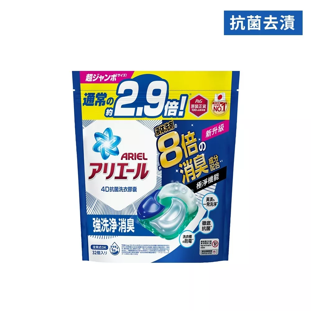 ARIEL 4D抗菌洗衣膠囊32顆袋裝-抗菌去漬/室內晾衣款式:抗菌去漬(藍)