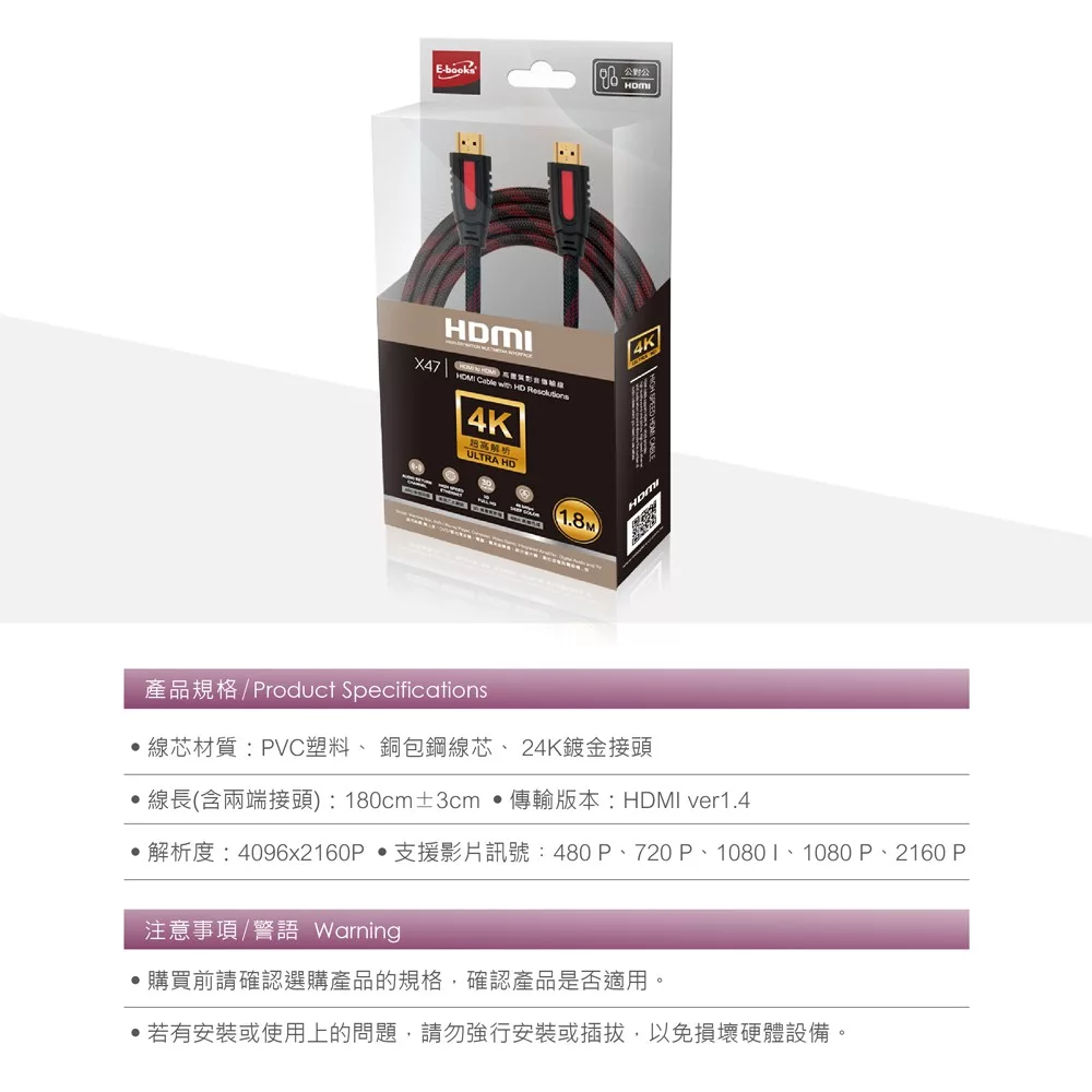 【商品規格】 產品重量:160g 包裝尺寸:12.2×3.2×21.2cm 產地:中國 【商品介紹】 線芯材質:PVC塑料、銅包鋼線芯、24K鍍金接頭 線長:180cm±3cm 傳輸版本:HDMI ver1.4 解析度:4096x2160P 支援影片訊號:480P、720P、1080I、1080P、2160P Deep Color技術:支援sYCC601、Adobe RGB、Adobe YCC601 TMDS傳輸頻寬:10.2~18 Gbit/s(秒) 影片頻寬:340MHz/8.16 Gbit/s(秒) 音訊頻寬:36.86 Mbit/s(秒) 色深:48 bit/px 額定電壓/電流:30VOLTS 線徑/導體:OD:7.3mm / 30AWG 【商品特色】 1. HDMI 1.4版 公對公 2. 3D高畫質Full HD 3. 4Kx2K高畫質 4. 高速乙太網路 5. 支援雙向音頻回傳,影像音訊同步零時差。 6. 具每秒10.2Gbps高速傳輸能力。 7. 一體成型熱壓鑄接頭+漁網編織線,有彈性、耐拉扯 8. HDMI ver1.4(可向下相容1.3、1.2版本) 【退換貨服務】 鑑賞期非試用期,退回產品必須是全新狀態且包裝完整 ( 保持產品、附件、包裝、廠商紙箱及所有附隨文件或資料之完整性 ) 。 【購買注意事項】 網路店所售出的商品僅可在網路店進行退換貨服務,將無法在全國佳瑪實體門市進行退換貨、退款服務。 若與實體門市價格不同時,請以網站公告為主。如需辦理退換貨,包裝與配件須完整(商品配件、包裝完整,無刮痕損傷) ●保固說明:非人為因素之損壞,原廠保固六個月。 ●使用前請確實遵從產品說明書內之操作指示及注意事項。