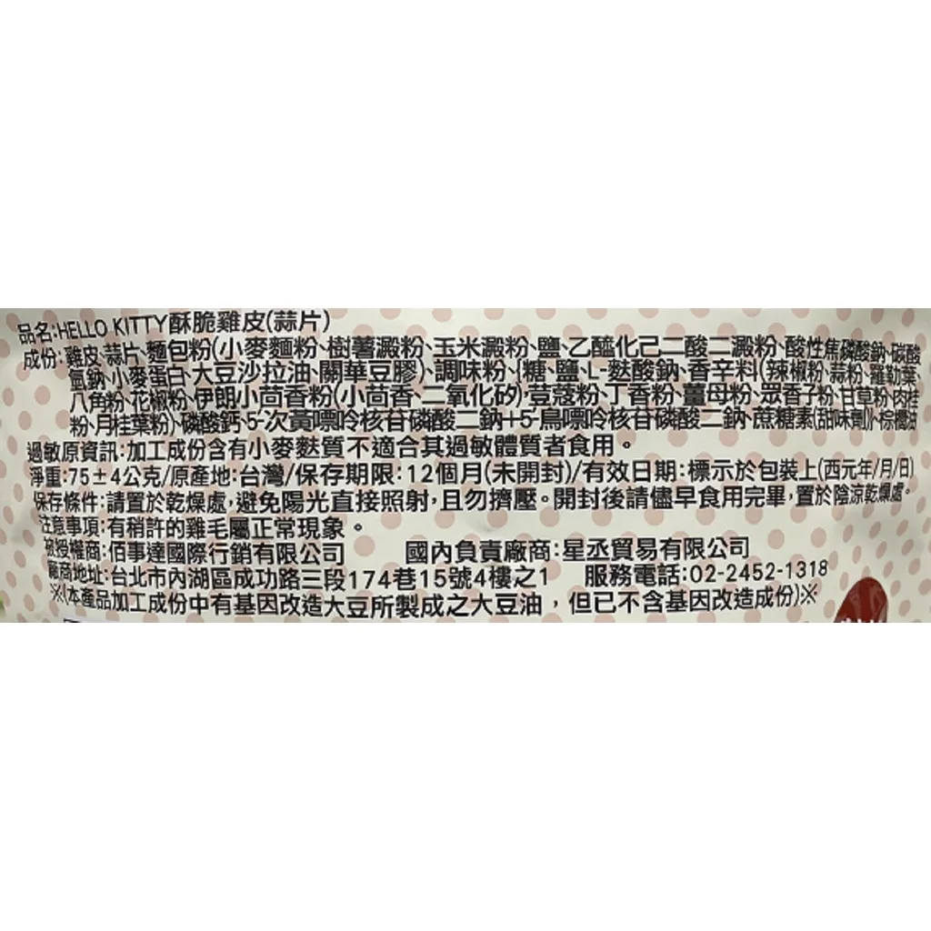 【商品規格】 蒜片:75g 【商品介紹】 台灣夜市特色炸雞皮美食,首度與可愛萌主HELLO KITTY合作,推出超級好吃的炸雞皮零嘴。 酥脆雞皮採用100%雞皮製作加入傳統十三調味, 嚴格精挑雞皮品質及特選調料,多次調整配料比例才研 發出跟雞皮完美結合的黃金口感。 【成份說明】 如圖示 【有效日期說明】 以消費者收受日起算,至少距有效日期前30日以上 【使用注意事項】 請置於陰涼乾燥處,避免高溫或陽光直曬。 【退換貨服務】 鑑賞期非試用期,退回產品必須是全新狀態且包裝完整 ( 保持產品、附件、包裝、廠商紙箱及所有附隨文件或資料之完整性 ) 。 【購買注意事項】 網路店所售出的商品僅可在網路店進行退換貨服務,將無法在全國佳瑪實體門市進行退換貨、退款服務。若與實體門市價格不同時,請以網站公告為主。 ●依據消費者保護法之規定,食品類商品屬於易於腐敗、保存期限較短之商品,蝦皮鑑賞期規範效期在兩個月內之商品,於收受商品後將無法享有猶豫期之權益且不得辦理退貨。 ●網頁商品會因為使用不同的品牌螢幕以及解析度不同,造成圖片顏色呈現略有不同,請以實品顏色為準。