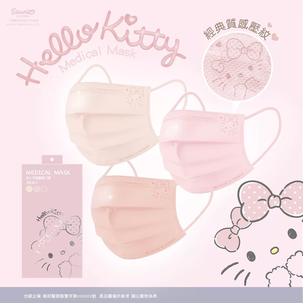 Hello Kitty 鋼印款成人平面醫療口罩 3色30入 共4款規格:粉色系