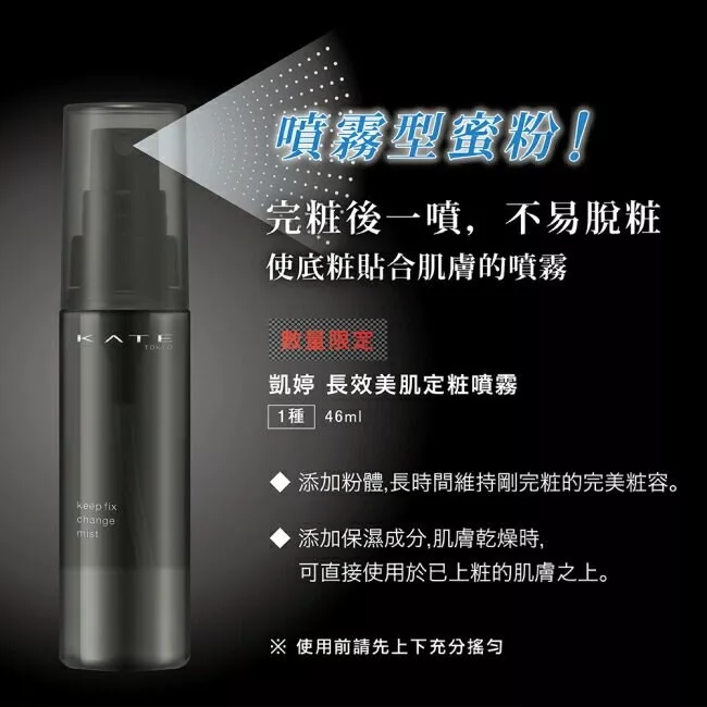 【商品規格】 規格/容量:46ml 尺寸:3.4×3.4×13.3 產地:日本 【商品介紹】 噴霧型蜜粉! 完粧後一噴,不易脫粧,使底粧貼合肌膚的噴霧。 *添加粉體,長時間維持剛完粧的完美粧容。 *添加保濕成分,肌膚乾燥時,可直接使用於以上粧的肌膚之上。 【成份說明】 詳見外包裝 【使用方式】 使用前請先上下充分搖勻,閉上雙眼,按壓適量噴霧於全臉,妝前妝後皆可使用。 【使用注意事項】 如有不適,請暫停使用。 【退換貨服務】 鑑賞期非試用期,退回產品必須是全新狀態且包裝完整 ( 保持產品、附件、包裝、廠商紙箱及所有附隨文件或資料之完整性 ) 。 【購買注意事項】 網路店所售出的商品僅可在網路店進行退換貨服務,將無法在全國佳瑪實體門市進行退換貨、退款服務。若與實體門市價格不同時,請以網站公告為主。