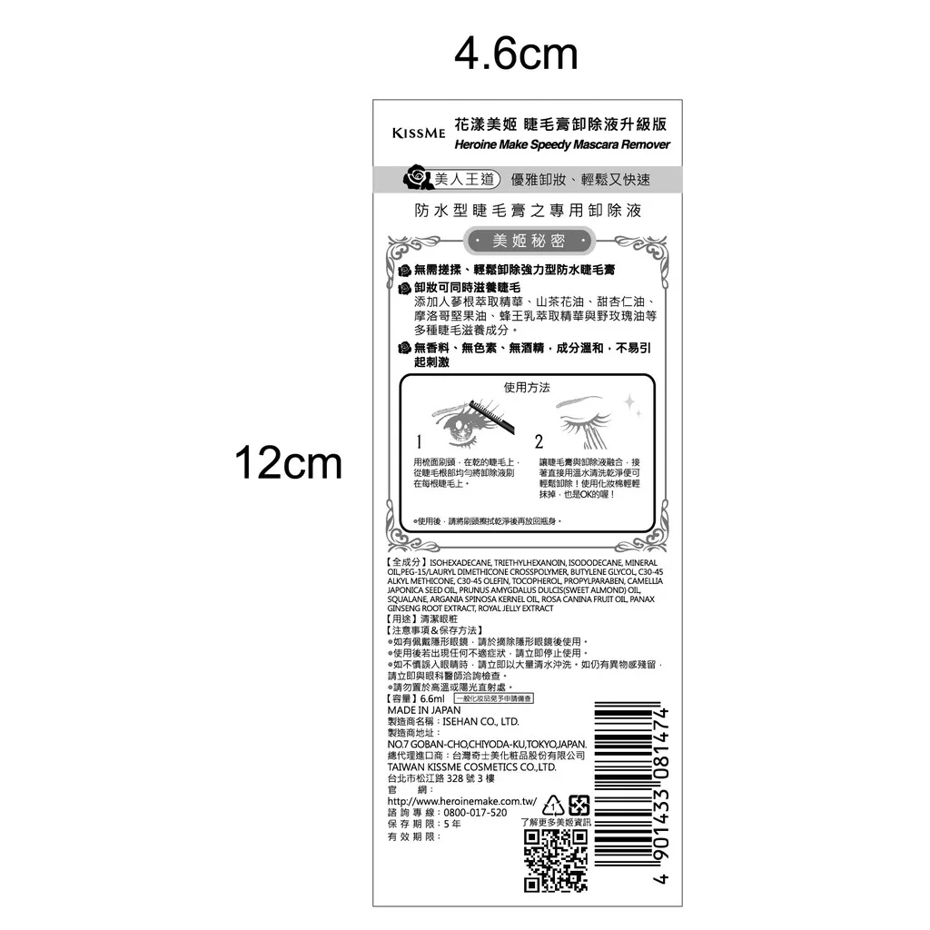 【商品規格】 規格/容量:6.6ml 尺寸:W6.4xH18.3xD2.7cm 產地:日本 【商品介紹】 快速卸除強力型睫毛膏 溫和不刺激 齒狀刷頭,卸妝能力再升級 • 改良型齒狀刷頭 刷頭齒狀間距拉寬、加深,一次可以沾取更多卸除液,卸妝能力再升級,更快更乾淨! • 卸除液增量10%,加量不加價。(相較前一代) • 無須搓揉 輕鬆卸除強力防水型睫毛膏 • 卸妝同時滋養睫毛 添加人蔘根萃取精華、山茶花油、甜杏仁油、摩洛哥堅果油、蜂王乳萃取精華與野玫瑰油等多種睫毛滋養成分。 • 溫和不刺激 無香料、無色素、無酒精,無界面活性劑,成分溫和,不易引起刺激。 【成份說明】 詳見外包裝 【使用方式】 詳見外包裝 【使用注意事項】 1.使用後,請將刷頭擦拭乾淨後在放回瓶身。 2.如佩戴隱形眼鏡,請於摘除隱形眼鏡後使用。 3.使用後若出現任何不適症狀,請立即停止使用。 4.如不慎誤入眼睛時,請立即以大量清水沖洗,如仍有異物感殘留,請立即與眼科醫師洽詢檢查。 5.請勿置於高溫或陽光直射處。 【退換貨服務】 鑑賞期非試用期,退回產品必須是全新狀態且包裝完整 ( 保持產品、附件、包裝、廠商紙箱及所有附隨文件或資料之完整性 ) 。 【購買注意事項】 網路店所售出的商品僅可在網路店進行退換貨服務,將無法在全國佳瑪實體門市進行退換貨、退款服務。若與實體門市價格不同時,請以網站公告為主。