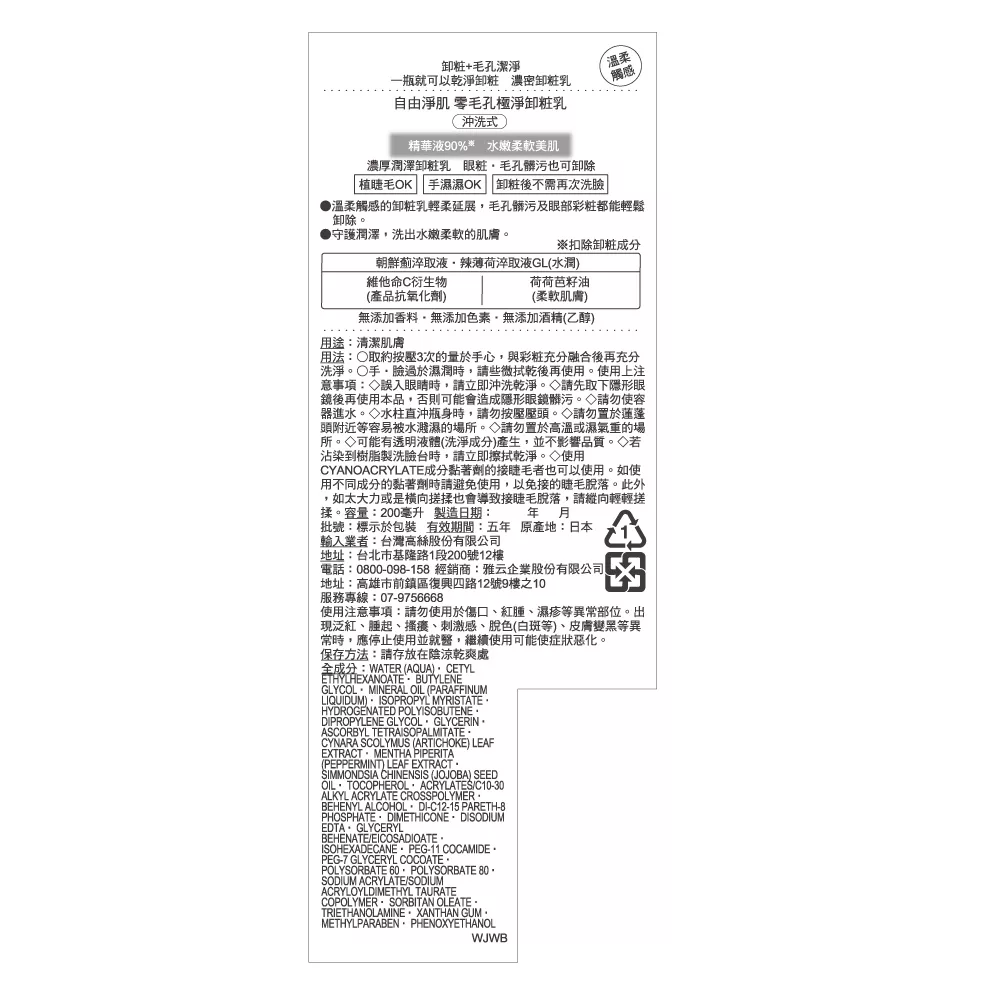 【商品規格】 規格/容量:200g 尺寸: 長54(mm) * 寬54(mm) * 高191(mm) 產地:日本 【商品介紹】 精華液90% 水嫩柔軟美肌 濃厚潤澤卸妝乳 眼粧.毛孔髒污也可卸除 植睫毛OK 手濕濕OK 卸粧後不須再次洗臉 【成份說明】 詳見外包裝 【使用方式】 取適量於手心(約按壓2〜3次),以指腹推開並與粉底等彩粧融合。 待徹底融合之後,再以清水或溫水洗淨即可。 【使用注意事項】 詳見外包裝 【退換貨服務】 鑑賞期非試用期,退回產品必須是全新狀態且包裝完整 ( 保持產品、附件、包裝、廠商紙箱及所有附隨文件或資料之完整性 ) 。 【購買注意事項】 網路店所售出的商品僅可在網路店進行退換貨服務,將無法在全國佳瑪實體門市進行退換貨、退款服務。若與實體門市價格不同時,請以網站公告為主。