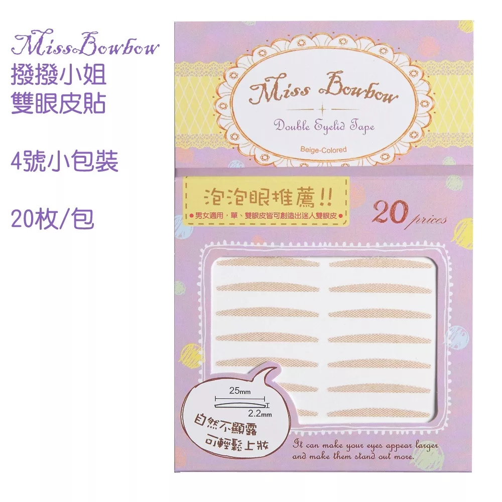 shopee simple 10101630 4713105831283 Miss Bowbow撥撥小姐3M雙眼皮貼(小包裝)【小女子】粉色款 內雙眼皮推薦 1 0 visible 【商品規格】 規格/容量: 綠色款 深邃眼眸推薦 Type.2 寬25mm 高4mm(16枚入) 粉色款 內雙眼皮推薦 Type.3 寬25mm 高3mm(20枚入) 紫色款 泡泡眼推薦 Type.4 寬25mm 高2.2mm(20枚入) 藍色款 防尾垂推薦 Type.5 寬25mm 高5mm(16枚入) 產地:台灣 【商品介紹】 ※小包裝內小夾子 自然不顯露,可上妝 打造深邃大眼 【成份說明】 美國進口3M透氣膠帶 【使用方式】 1.使用專用小夾子將雙眼皮貼從邊緣挑開後夾起。 2.找出眼皮的褶線,將雙眼皮貼貼高於摺線處,並用小夾子調整好位置。 【使用注意事項】 1. 請置於幼兒無法取得處 2. 如有傷口或是紅腫發膿或裂傷的地方請勿使用 3. 使用後如肌膚有過敏現象,請立即停止使用 4. 請置於陰涼處,避免高溫照射 【退換貨服務】 鑑賞期非試用期,退回產品必須是全新狀態且包裝完整 ( 保持產品、附件、包裝、廠商紙箱及所有附隨文件或資料之完整性 ) 。