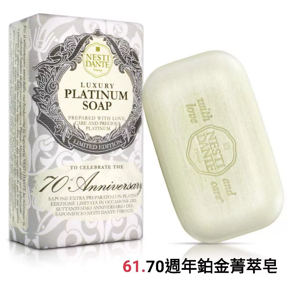 【商品規格】 容量:250g 產 地:義大利 保存期限:五年 【商品介紹】 ♥ 60週年黃金能量皂 為了慶祝Dante 先生在佛羅倫斯開始了他的第一個熱鍋爐到今年的60年黃金週年,Nesti香皂專家特別以昂貴的金箔葉為原料,打造出一款重250克的黃金尊貴香皂,這是一款為大家所喜愛且充滿過去、現代及未來主義美學的超高價值產品。 這款以金箔為材質的香皂,有如絲絨般輕柔的鴛尾花味調-佛羅倫斯之花,如同總會帶著一塊金箔香皂的瑪麗麥德奇所說的:「這是來自這塊香皂不可抗拒的感官享受」。 ♥ 70週年鉑金菁萃皂 追求卓越的製皂品質不停地向前邁步,至今已經擁有了70年的歷史!今年為了慶祝 NESTI DANTE 先生在佛羅倫斯開始了他的第一個熱鍋爐到今年的70週年,NESTI 的香皂師傅經過十年的研發,以卓越創新的製皂技術,選用了有史以來最珍貴的鉑金原料,打造出「70週年典藏紀念版-鉑金菁粹皂」,由於鉑金本身是相當珍貴稀有的成分,同時也是新一代突破性的珍貴美容保養成分,鉑金經過提煉萃取成鉑金膠,其中內含的鉑金分子能有效滲入肌膚,來調理肌膚狀態,改善肌膚暗沉、乾燥的問題,快速調理肌膚狀態,保持水潤。 「70週年典藏紀念版-鉑金菁粹皂」的靈感來自古老的芳香技術,而鉑金正是不可或缺的珍貴材料。鉑金獨特而高貴,象徵著神聖光潔不容玷污的自然純淨之美,NESTI更融入了山茶花和白茉莉的香氛,給您一場神秘美好的身心沐浴盛宴。 ♥ 尊寵黑金淨化皂 埃及豔后御用黑金香皂 『 淨化毛孔、細緻肌膚 』象徵美麗、聰明和權力的埃及艷后克莉奧‧帕特拉,一直以來都是女性氣質、神秘和誘惑力的代表,傳說羅馬帝國時代的朱利斯‧凱撒和馬克‧安東尼奧,兩人都愛上了埃及艷后,這位被譽為最迷人的古代女性之一。 埃及豔后非常重視保養,每日使用豐饒的驢奶進行沐浴儀式,是眾所皆知的。但只有少數人知道她真正的護膚秘訣,是選用黑金香皂來清潔淨化她的細緻肌膚;傳聞哲學家老普尼也曾表示,埃及豔后的美膚秘密正是使用黑金香皂沐浴,以達到保濕、預防皺紋、軟化肌膚並增亮膚色。 溫和潔淨功能,深受東方女性推崇及喜愛 特選生長於非洲肥沃土壤的車前草、燕麥及可可豆莢,有助於肌膚的深層潔淨,並選用具保濕特性的乳木果油成份,溫和地促進循環及細胞更新;這一款新配方並添加了有助提振精神的廣藿香、辛辣粉紅胡椒、感性風信子和新鮮茉莉花,營造出意想不到的豐富華麗香氛。 ♥ 堅持最好,手工製皂 ♥ 佛羅倫斯是托斯卡尼的首府,也是文藝復興城市,這裡匯集了歷史文化及地中海天然植物資源,充分沿用古老的製造技術, 堅持使用最高品質的植物油如:棕櫚油、棕欖果仁油等生產以植物油脂為主的歐洲傳統手工皂, 品質精純,溫和潔淨不易刺激。 來自佛羅倫斯的Nesti Dante手工香皂帶給您的不僅是天然精緻手工,傳承古歐洲的人文藝術與歷史! Nesti Dante 為了實現維護地球環境的使命,堅持簡單、自然,與大自然和平共處,並在皂品的製作上確實落實,不只讓人們變美,也讓地球變美了。 【使用方式】 肥皂–適量抹於身體,用水洗淨。保持身體清潔。 【使用注意事項】 使用後如有皮膚不適之現象,請停止使用,並請教皮膚科醫生。 【退換貨服務】 鑑賞期非試用期,退回產品必須是全新狀態且包裝完整 ( 保持產品、附件、包裝、廠商紙箱及所有附隨文件或資料之完整性 ) 。 【購買注意事項】 網路店所售出的商品僅可在網路店進行退換貨服務,將無法在全國佳瑪實體門市進行退換貨、退款服務。若與實體門市價格不同時,請以網站公告為主。