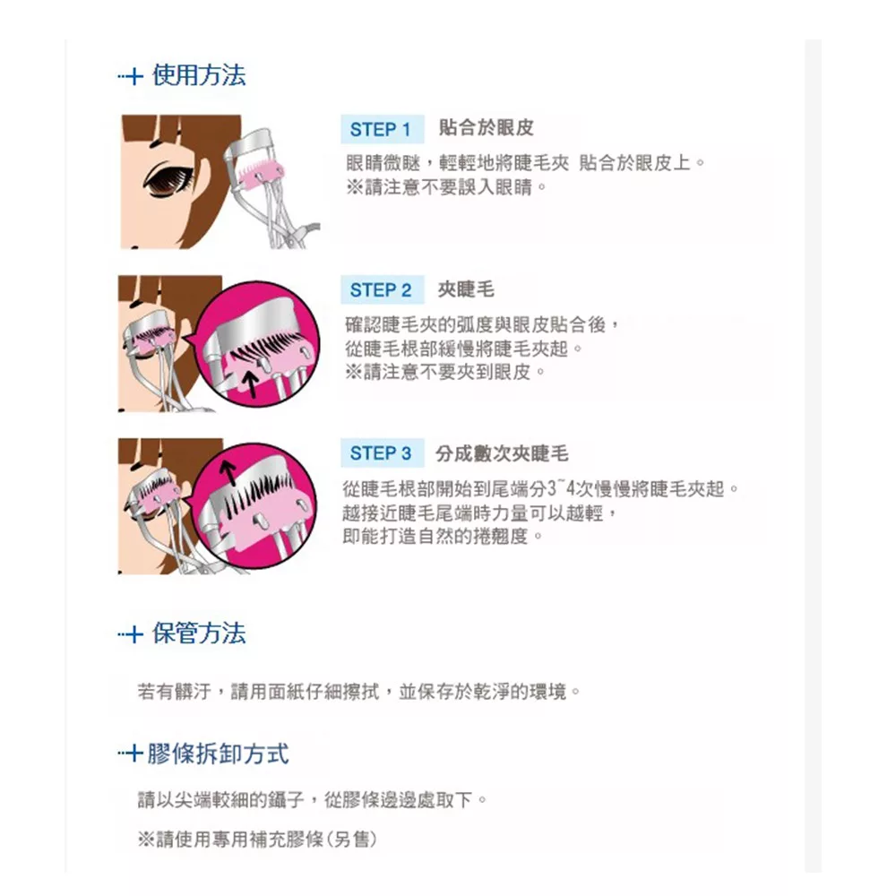 【商品規格】 規格/容量:1入 重量:39g 尺寸:10*38*15cm 產地:中國 【商品介紹】 獨家睫毛梳設計,深入睫毛間空隙,打造完美扇型超廣弧度.睫毛梳尖端為外翻設計,不容易刺到眼睛,使用更安心. 【成份說明】 不鏽鋼鍍鎳,PP聚丙烯,合成橡膠. 【使用方式】 1.使用前請先確認睫毛夾本體和睫毛梳無破損或脫落後再使用. 2.建議於上睫毛膏之前使用睫毛夾.若要在睫毛膏之後使用,請待睫毛膏完全乾燥後再使用. 3.眼睛微瞇,輕輕地將睫毛夾貼合於眼皮上.(請注意睫毛梳不要誤觸眼睛). 4.確認睫毛夾的弧度與眼皮貼合後,從睫毛根部緩慢將睫毛夾起.(請注意不要夾到眼皮). 5.從睫毛根部開始到尾端分3~4次慢慢將睫毛夾起.越接近睫毛尾端時力量可以越輕,即能打造自然的捲翹度. 6.欲拆除膠條時,請以尖端較細的鑷子從膠條邊邊處取下. 【使用注意事項】 1.請勿使用於其他用途. 2.睫毛夾有髒汙時,請用面紙仔細擦拭乾淨再使用或保存. 3.請一邊看著鏡子使用,並注意周遭環境,以策安全. 4.使用時請注意不要誤觸眼睛. 5.使用前請注意睫毛梳是否移位,若於變形的狀態下使用,可能會導致睫毛受傷,請注意. 6.使用睫毛夾時,若在夾著睫毛的狀態下過於用力拉扯或擠壓,有可能會造成睫毛的脫落或斷裂. 7.使用時請勿將睫毛梳的部分取下. 8.眼皮或眼睛有異常狀況時,請勿使用.若使用時眼部有任何異常狀況,請立即停止使用,並諮詢醫師. 9.依據個人使用及保存狀況,商品可能會變形,褪色. 10.膠條若有磨損或破損,請換新,以避免導致受傷. 11.若商品有破裂或鬆脫時,請立即停止使用. 12.請勿使商品受到強烈撞擊,並遠離水氣及火氣. 13.請保存於孩童拿不到的地方. 14.使用中如因不當使用或錯誤的使用方式造成傷害,本公司不承擔責任,請諒解. 【退換貨服務】 鑑賞期非試用期,退回產品必須是全新狀態且包裝完整 ( 保持產品、附件、包裝、廠商紙箱及所有附隨文件或資料之完整性 ) 。 【購買注意事項】 網路店所售出的商品僅可在網路店進行退換貨服務,將無法在全國佳瑪實體門市進行退換貨、退款服務。若與實體門市價格不同時,請以網站公告為主。