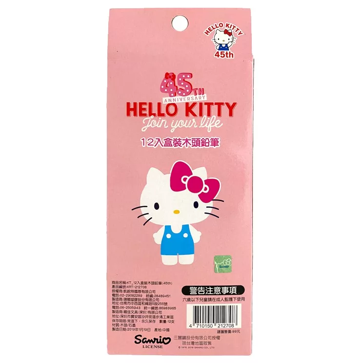 【商品規格】 規格:12入 【商品介紹】 KT-12入鉛筆(45週年紀念款) 2B筆芯細鉛筆,筆身圓型 【注意事項】 1. 請勿放置於潮濕處或高溫日照下 2. 請勿放置於幼兒易取處 3. 請勿接近火源以及腐蝕性溶劑 【退換貨服務】 鑑賞期非試用期,退回產品必須是全新狀態且包裝完整 ( 保持產品、附件、包裝、廠商紙箱及所有附隨文件或資料之完整性 ) 。 【購買注意事項】 網路店所售出的商品僅可在網路店進行退換貨服務,將無法在全國佳瑪實體門市進行退換貨、退款服務。若與實體門市價格不同時,請以網站公告為主。