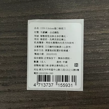 【商品規格】 規格/容量:3入/包 產地:中國 國外平行輸入 【成份說明】 詳見外包裝 【使用方式】 修眉前,先將其部位擦上乳液潤滑,再依毛髮順向生長方向使用 【使用注意事項】 1.刀刃鋒利危險請小心使用。 2.維護個人衛生應避免與他人共用,避免兒童拿取。 【退換貨服務】 鑑賞期非試用期,退回產品必須是全新狀態且包裝完整 ( 保持產品、附件、包裝、廠商紙箱及所有附隨文件或資料之完整性 ) 。 【購買注意事項】 網路店所售出的商品僅可在網路店進行退換貨服務,將無法在全國佳瑪實體門市進行退換貨、退款服務。若與實體門市價格不同時,請以網站公告為主。