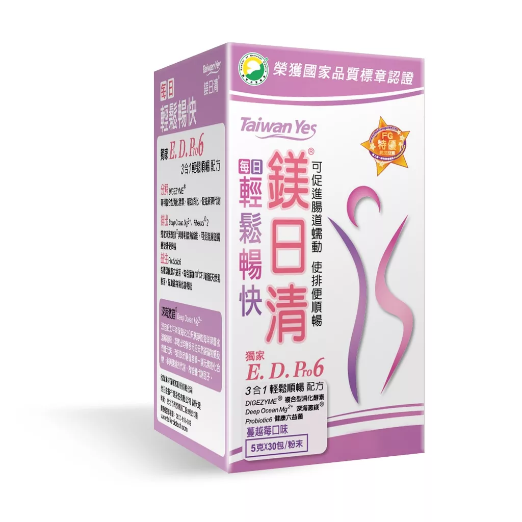 【商品規格】 規格:5g/包,30包/盒 保存期限:二年 營養標示:如包裝所示 產地:台灣 【商品介紹】 「鎂日清」連續5年榮獲國家品質標章認證及FG特優標章 含有獨家配方:深海激鎂®,提供體內所需多種礦物質元素 含有高含量機能性的益生菌與寡糖,維持腸道好生態 含有綜合酵素與功能性的水溶性纖維,促進排便 不含西藥成分與番瀉葉 每日輕鬆暢快,幫助維持消化道機能,使排便順暢 多國專利,深海激鎂®! 專利深層海水濃縮礦物質液含鎂、鉀、鈣等,多種天然離子態礦物質與微量元素, 擁有三項製程與功效專利,可迅速被人體吸收利用。 【成份說明】 如包裝所示 【使用方式】 每日一次,每次一包,多食無益。 餐後搭配適量溫水食用(水溫不宜超過50度C),睡前食用效果更佳。 14歲以下孩童請酌量減半,亦可加入果汁、飲料中食用。 孕婦及三歲以下孩童,請經醫師建議後方可使用。 【有效日期說明】 90天~365天-以消費者收受日起算,至少距有效日期前30日以上 【過敏原資訊】 本產品含有牛奶及其製品 【使用注意事項】 請置於陰涼乾燥處,避免高溫或陽光直曬。 【退換貨服務】 鑑賞期非試用期,退回產品必須是全新狀態且包裝完整 ( 保持產品、附件、包裝、廠商紙箱及所有附隨文件或資料之完整性 ) 。 【購買注意事項】 網路店所售出的商品僅可在網路店進行退換貨服務,將無法在全國佳瑪實體門市進行退換貨、退款服務。若與實體門市價格不同時,請以網站公告為主。 ●依據消費者保護法之規定,食品類商品屬於易於腐敗、保存期限較短之商品,蝦皮鑑賞期規範效期在兩個月內之商品,於收受商品後將無法享有猶豫期之權益且不得辦理退貨。 ●網頁商品會因為使用不同的品牌螢幕以及解析度不同,造成圖片顏色呈現略有不同,請以實品顏色為準。