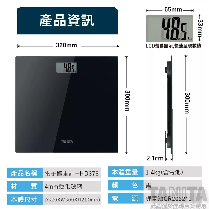 ***限宅配*** 【商品規格】 D320×W300×H21 mm 【商品介紹】 輕巧薄型機身,厚度10mm,重量4kg 強化玻璃,堅固安全 快速開機,踏觸機台中央,當螢幕出現””0.0″”即可開始量測 底部高彈性防滑腳墊,穩固不側翻 支點水平補償技術,受力狀態自動微調,量測數據更精準 簡約設計,高雅時尚 自動關機省電功能 【成份說明】 鏡面強化玻璃 【使用方式】 踏觸機台中央,當螢幕出現””0.0″”即可開始量測 【使用注意事項】 請置於陰涼乾燥處,避免高溫或陽光直曬。 【退換貨服務】 鑑賞期非試用期,退回產品必須是全新狀態且包裝完整 ( 保持產品、附件、包裝、廠商紙箱及所有附隨文件或資料之完整性 ) 。 【購買注意事項】 網路店所售出的商品僅可在網路店進行退換貨服務,將無法在全國佳瑪實體門市進行退換貨、退款服務。若與實體門市價格不同時,請以網站公告為主。