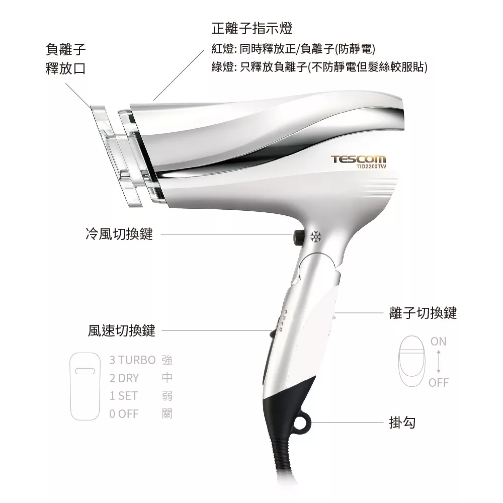 【超商取貨限制】每筆訂單最多5kg(8個)(無法與其他商品合購) 超過5kg,請選擇賣家宅配。謝謝配合! 【商品規格】 產品型號 TID2200TW 電源 AC 110V 60Hz 風量 2.0M³/分 消耗電量 1500W ( 3-熱風 ) 熱風溫度 120℃ (環境溫度30℃ 2-熱時的溫度) 電線長度 1.7m 重量 570g (本體) 590g (安裝保濕式標準吹嘴時) 附屬配件 保濕式標準吹嘴 安全裝置 防過熱裝置 (溫控器、溫度保險絲) 尺寸 長 283 x 寬 194 x 高 90 mm (本體) 【商品介紹】 ● 速乾! 超級大風量1.9M³/分 ● 抑制靜電有效對抗毛躁髮質 ● 修護離子強效保濕修護髮尾 ● 雙氣流風罩設計造型輕鬆吹 【退換貨服務】 鑑賞期非試用期,退回產品必須是全新狀態且包裝完整 ( 保持產品、附件、包裝、廠商紙箱及所有附隨文件或資料之完整性 ) 。 【購買注意事項】 網路店所售出的商品僅可在網路店進行退換貨服務,將無法在全國佳瑪實體門市進行退換貨、退款服務。若與實體門市價格不同時,請以網站公告為主。
